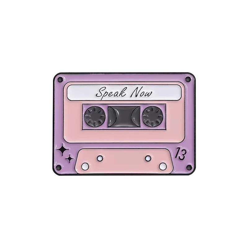 Le pin émaillé en forme de cassette musicale apporte un motif rétro avec l'inscription Speak Now, qui est placée sur la partie supérieure du design. Le visuel est complété par de délicats détails, tels que de petits éléments décoratifs et le chiffre 13 dans le coin, qui sont visibles sur l'image. L'ensemble en tons rose-violet est à la fois frappant et conserve un aspect simple et épuré. Cet accessoire convient pour un usage quotidien ainsi que comme détail thématique.