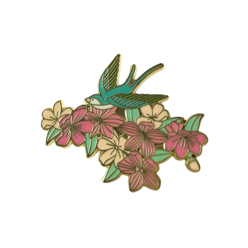 Ce pin émaillé combine le motif d'un oiseau avec des fleurs, créant ainsi un motif naturel intéressant. La composition est constituée d'un oiseau stylisé posé entre des fleurs épanouies, qui complètent l'ensemble du design. Grâce à cette combinaison, l'insigne agit comme un élément décoratif délicat inspiré de la nature.