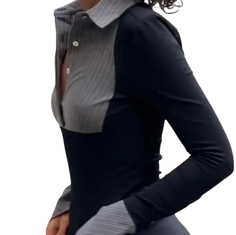 Polo femme à manches longues Noir Col en V avec col et boutons Top en polyester