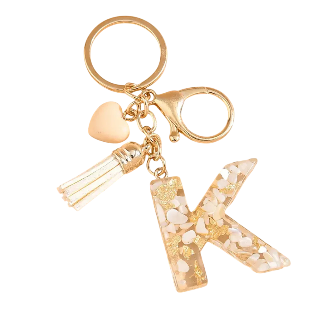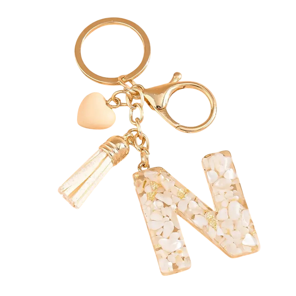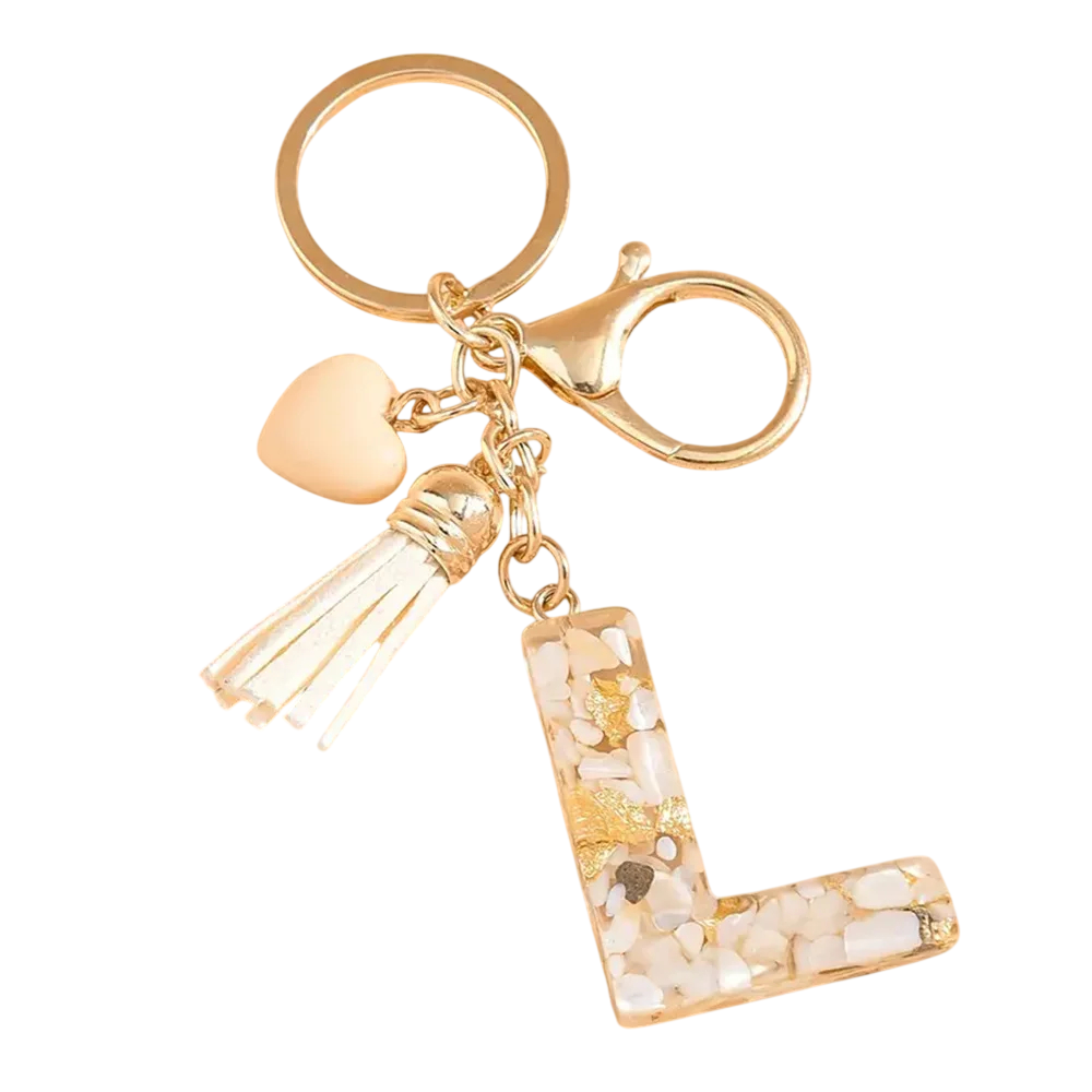 Accessoire en résine élégant avec initiales blanches et cœur de 4 cm est un ornement stylé pour clés et sac à main. Description complète