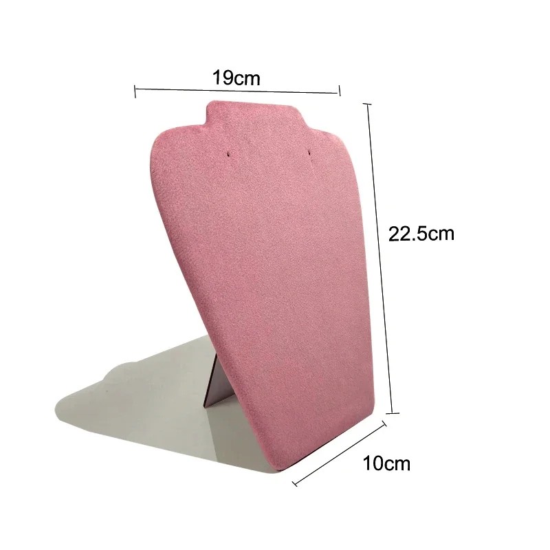 Ce porte-colliers est conçu pour exposer des colliers ou des chaînes. La surface du support est recouverte de velours rose, créant un fond délicat adapté à la présentation de bijoux à la maison, dans une vitrine ou sur un comptoir de vente.