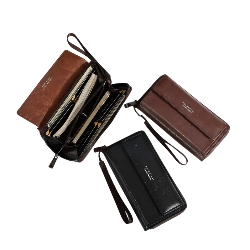 Pratique portefeuille long avec grande capacité, zip et poignée de main. Organisation claire, cuir synthétique et fermeture sécurisée. Description complète