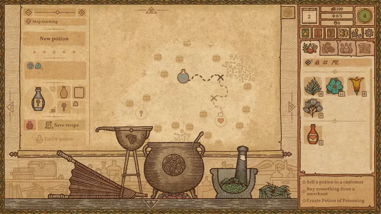 Planifiez soigneusement votre parcours à l'aide de la carte d'alchimie pour combiner différents effets. Gardez à l'esprit le bon sens : vous ne trouverez pas de marché pour une potion médicinale toxique… n'est-ce pas ? Ou peut-être que si ?