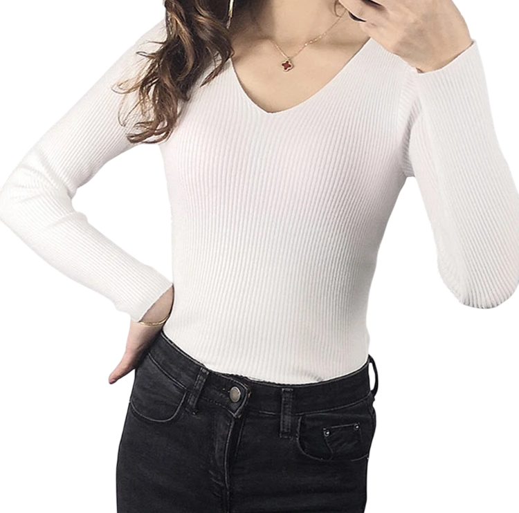 Pull en tricot pour femmes en coton et acrylique avec décolleté en V Pull uni élégant à manches longues Taille universelle pour un usage quotidien