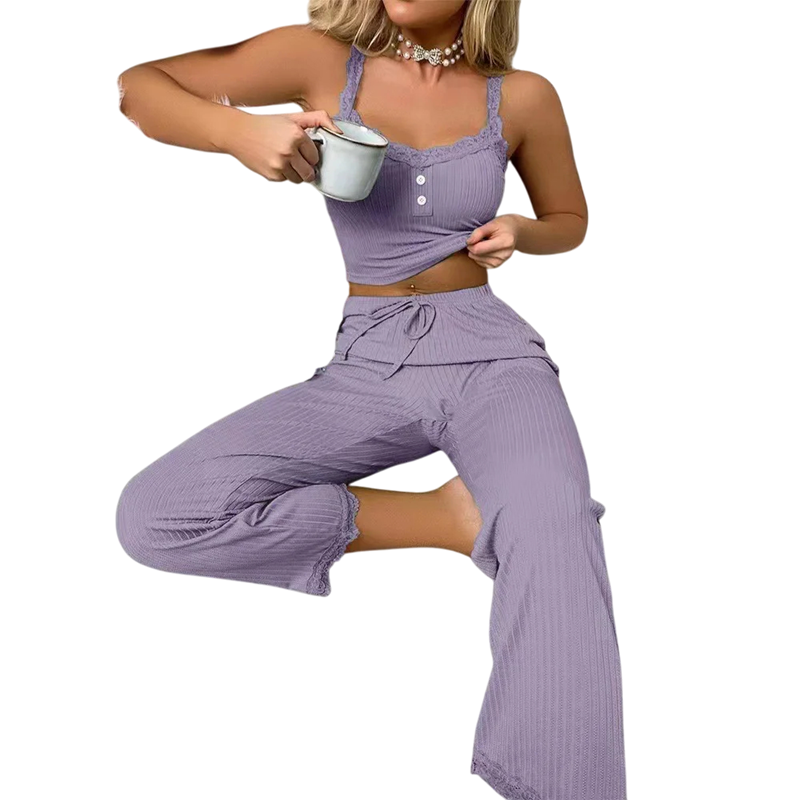 Le matériau est léger et lisse, assurant un contact agréable sur la peau. Le débardeur à fines bretelles donne au pyjama un caractère estival, idéal pour les journées et nuits chaudes, tandis que les pantalons avec taille élastique garantissent une liberté de mouvement et un confort parfait. La combinaison d'un design minimaliste et de matériaux de qualité fait de ce pyjama un choix parfait pour un usage quotidien.