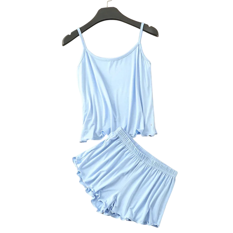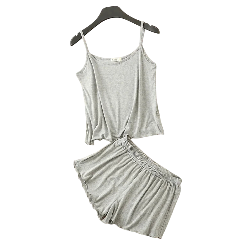 Pyjama léger pour femme en doux modal et spandex avec débardeur et shorts. Coupe confortable, col rond et matière agréable. Description complète