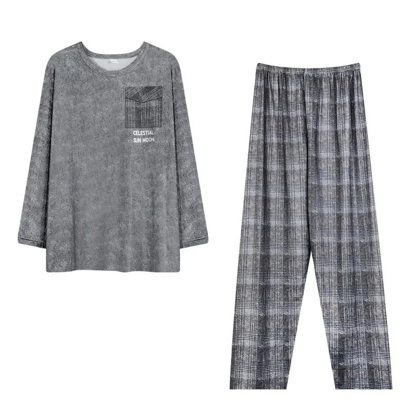 Pyjama pour homme à manches longues et pantalon à carreaux O col Polyester Spandex Pyjama gris confortable avec poche