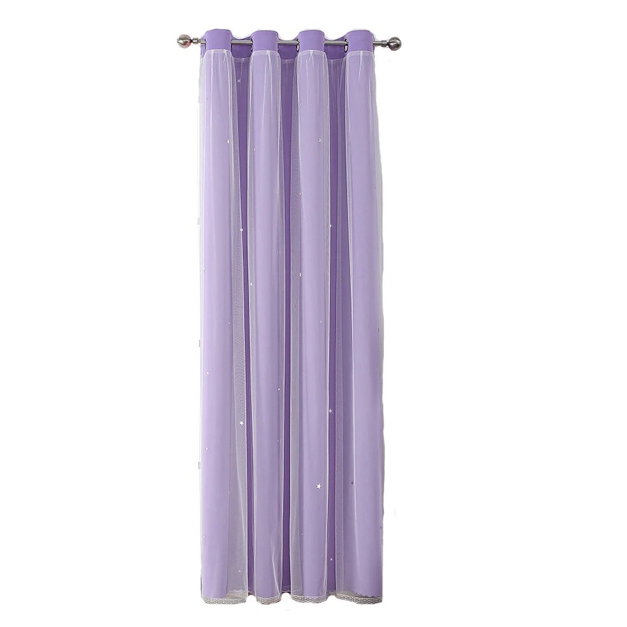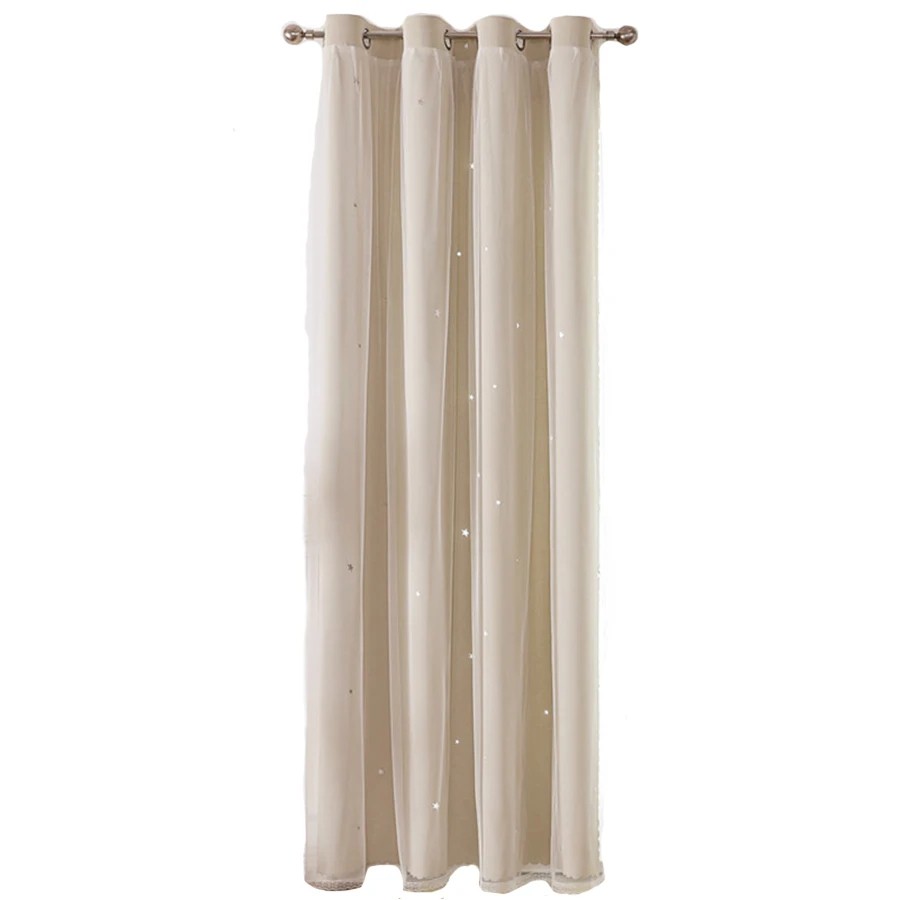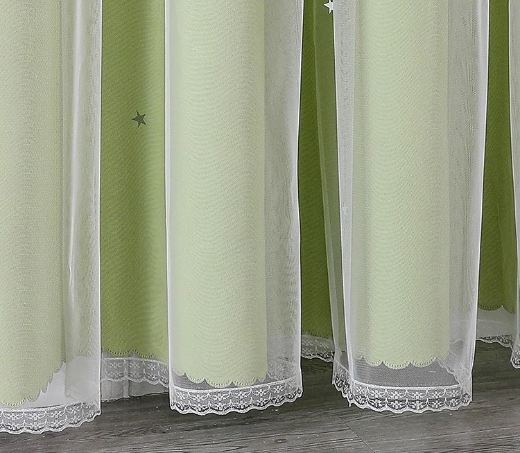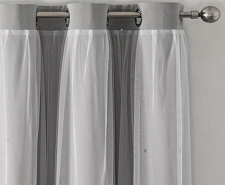 Des rideaux à deux couches avec des étoiles pour la chambre d'enfant combinent des tissus opaques et des voilages transparents, ajoutant un effet magique. Description complète