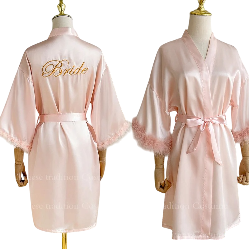 Page d’accueil Page d’accueil Vêtements et accessoires Vêtements et accessoires femme Lingerie de nuit femme Peignoirs femme Robe de mariée pour femme avec bords en peluche aux manches Inscription Bride Ceinture à nouer autour de la taille Robe légère en polyester et soie artificielle