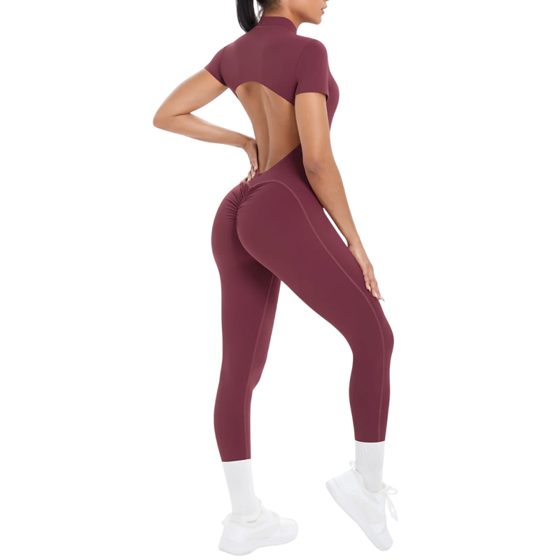 Salopette de sport pour femmes en nylon et spandex à manches courtes, dos nu, zip au décolleté et coupe leggings pour un mouvement actif. Description complète