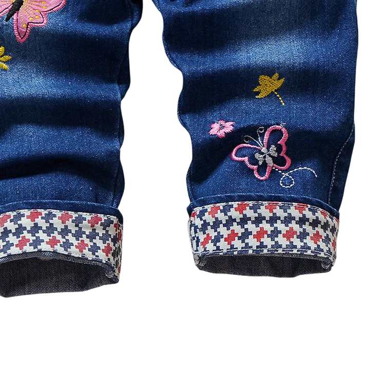Salopette en jean pour fille avec broderie Pantalons longs Bretelles réglables à boutons Combinaison confortable en coton et polyester Vêtements enfants tendance