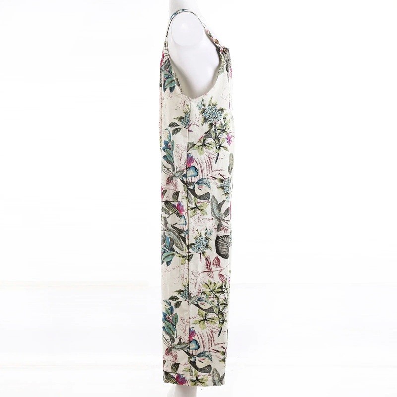 Salopette femme à fleurs Décolleté rond Pantalons longs Débardeur à larges bretelles Coupe légère d'été Matériau polyester lin