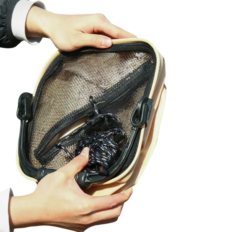 Le seau est équipé d'un couvercle supérieur avec fermeture éclair, permettant de fermer le contenu tout en offrant un accès rapide. À l'intérieur, il y a une poche en filet avec fermeture éclair, idéale pour ranger de petits accessoires. Une poignée pratique facilite le transport même lorsqu'il est rempli d'eau. Un corde d'environ 5 mètres est également inclus, pouvant être utilisé par exemple pour puiser de l'eau.