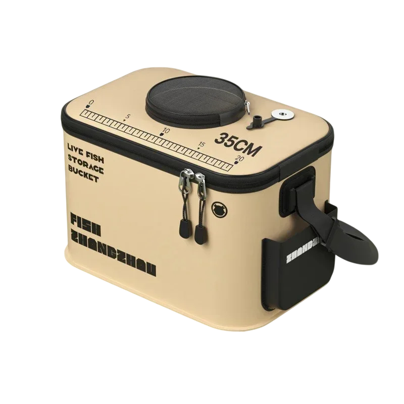 Seau de pêche pliable avec couvercle et filet 35 × 24 × 20 cm en matériau EVA beige avec poche et support pour poissons vivants et eau
