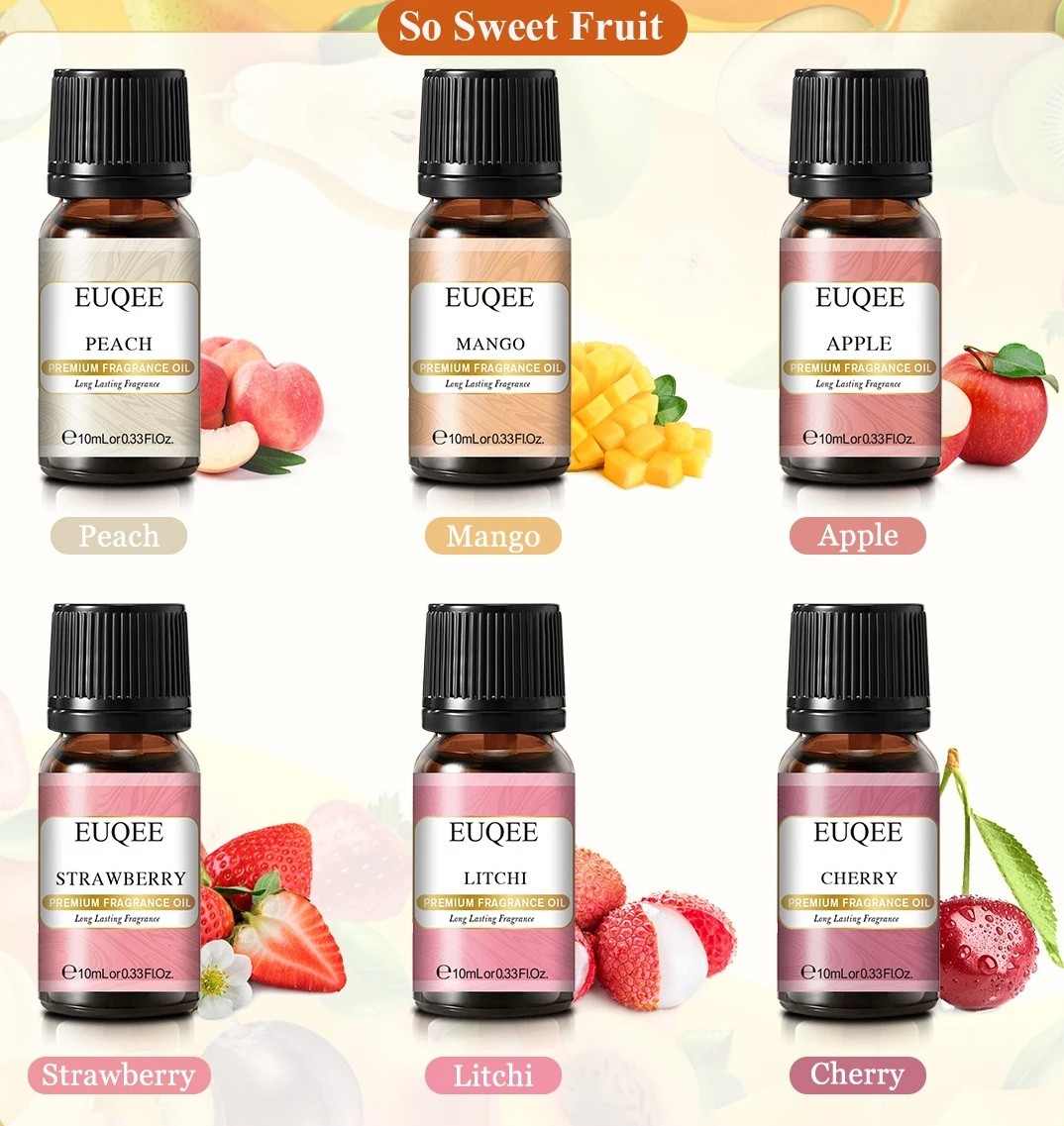 Série d'huiles parfumées So Sweet 6×10 ml emballage cadeau 165 × 72 mm pêche mangue pomme fraise litchi cerise pour diffuseur