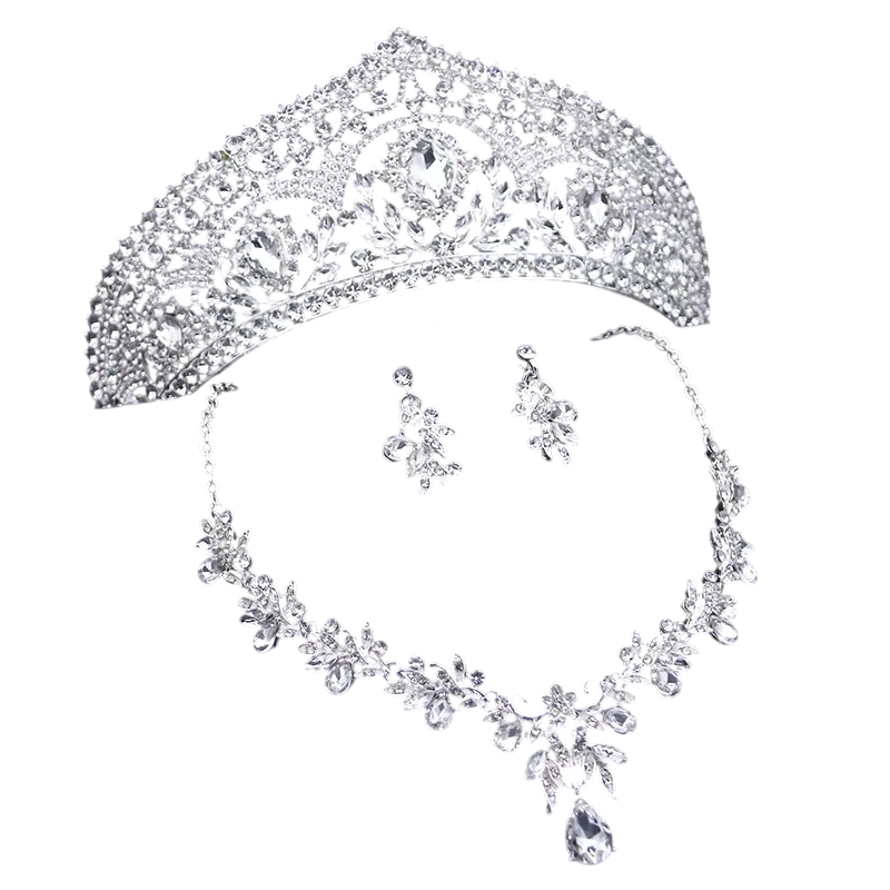Ensemble de princesse avec couronne, collier et boucles d'oreilles. Idéal pour un mariage, un bal ou des célébrations avec une touche royale. Description complète