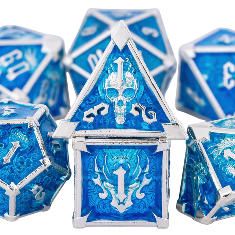Ce set thématique de dés est conçu pour les jeux de société et les jeux de rôle avec un accent sur un style visuel frappant. Il contient 7 dés de jeu, qui constituent une combinaison standard utilisée dans les systèmes RPG et les jeux de type Donjons et Dragons. Le motif crâne en version fantasy sombre donne aux dés un caractère distinctif et soutient l'atmosphère du monde de jeu.