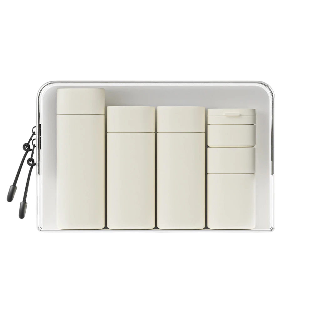 Les flacons ont une forme simple, ce qui facilite la manipulation et le remplissage. Les bouchons sont conçus pour permettre un dosage facile du contenu. L'ensemble est adapté à un usage quotidien ainsi qu'aux voyages prolongés, lorsque vous avez besoin de tout organiser de manière claire.