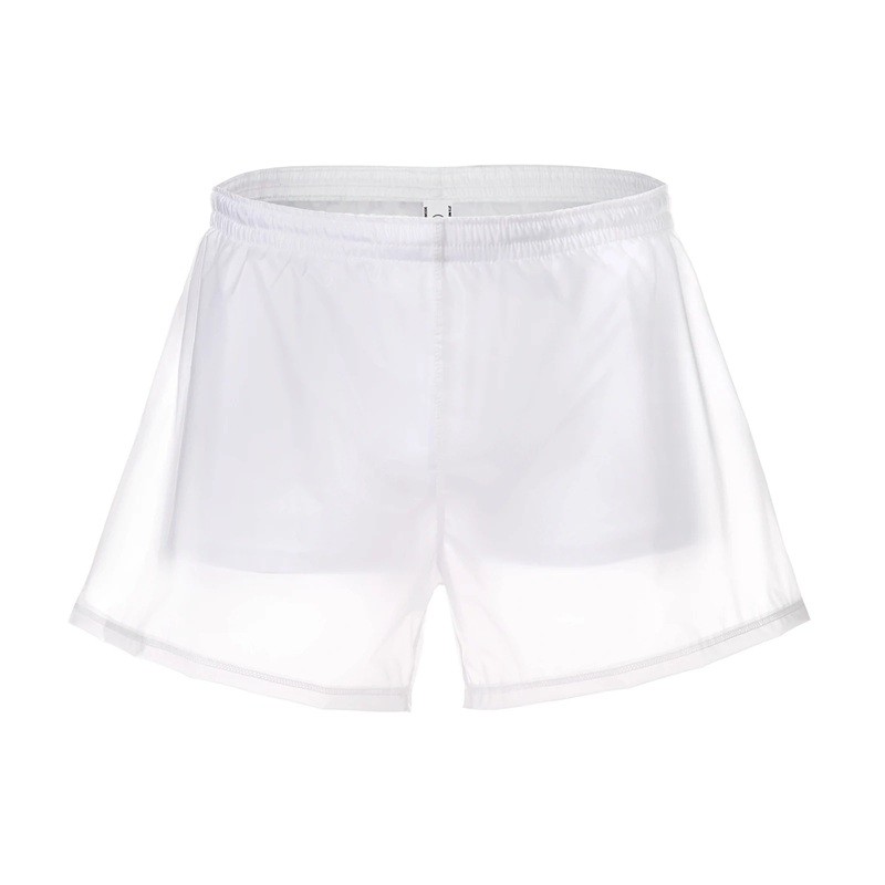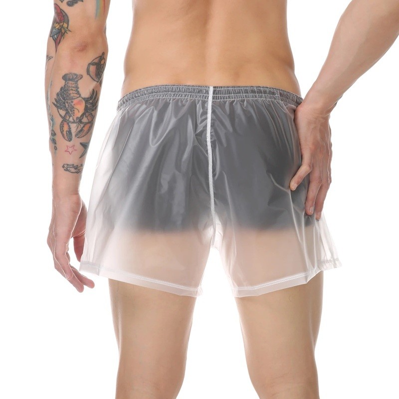 Shorts de bain à double couche avec couche supérieure transparente, en polyester léger et cordon de serrage. Description complète