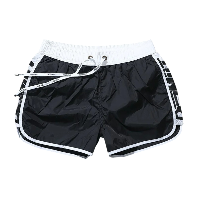 Maillots de bain sportifs avec rayures et inscription sur les côtés, matériau à séchage rapide et cordon de serrage confortable pour un été actif au bord de l'eau. Description complète