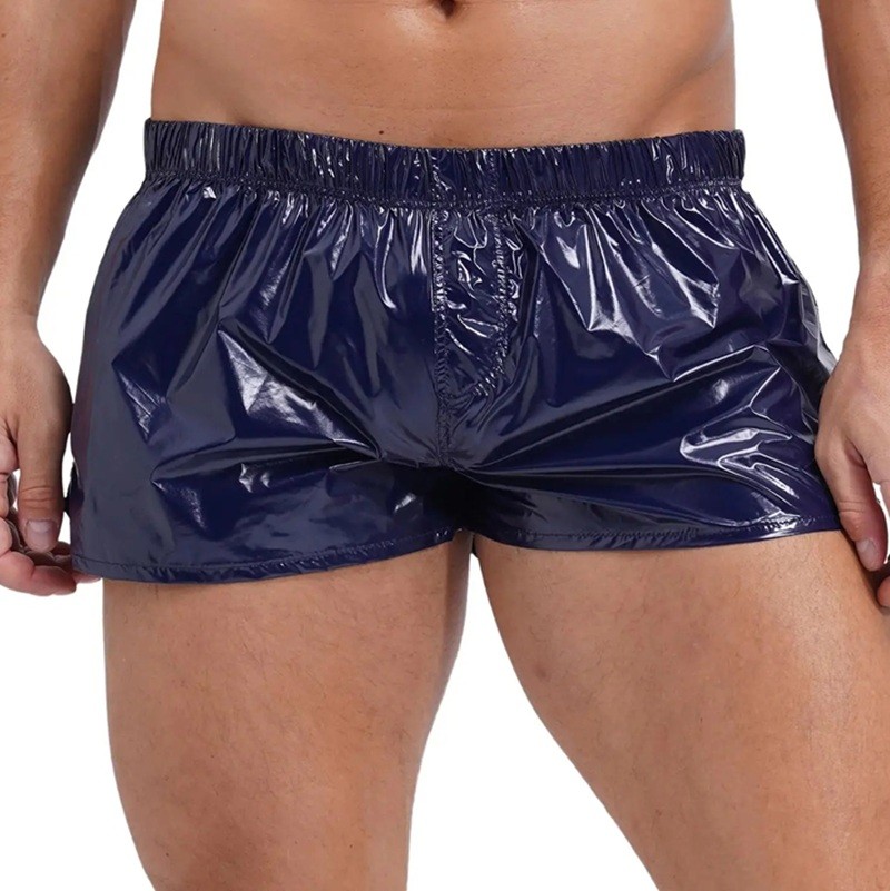 Shorts de bain brillants en bleu foncé avec taille élastique, confortables et à séchage rapide pour la plage et la piscine. Description complète