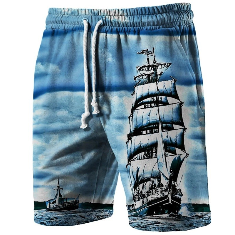 Shorts de bain légers avec imprimé de bateau, cordon et poches. Polyester à séchage rapide, idéal pour la plage et la piscine. Description complète