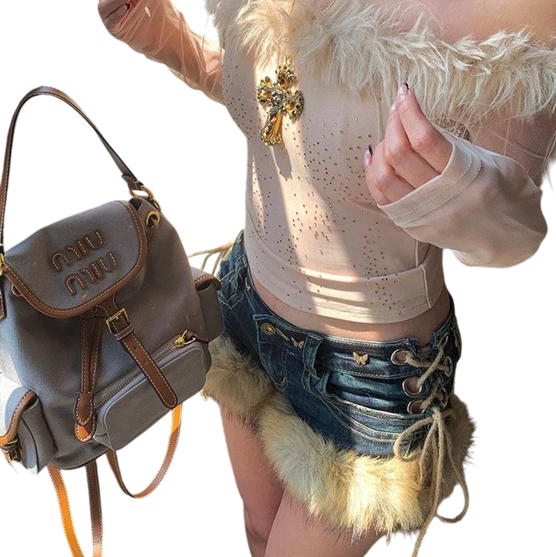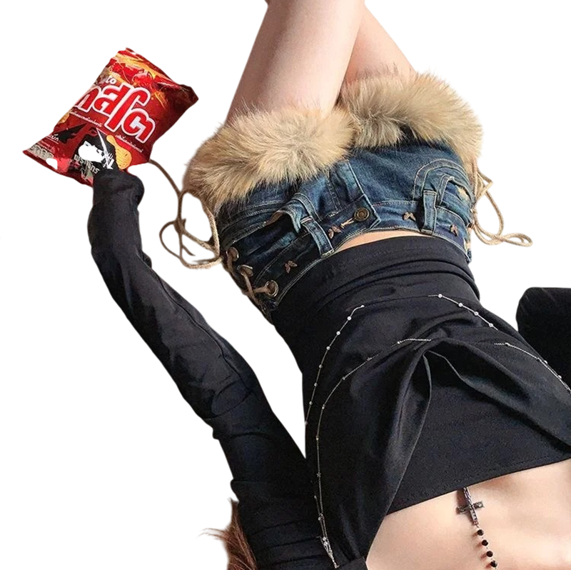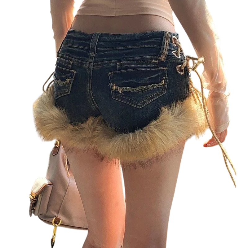 Shorts en jean bleu à taille basse, avec nœuds et fourrure sur les jambes, idéaux pour un look audacieux. Description complète