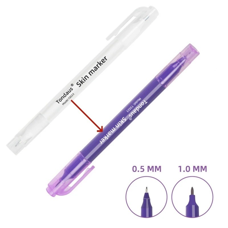 couleur violette de la marque est bien visible sur la peau et aide à maintenir la précision lors du dessin des formes. Le stylo de marquage est adapté tant pour un usage cosmétique professionnel que pour un travail créatif à domicile. Il est léger, compact et facilement transportable, ce qui permet de l'avoir toujours à portée de main lors de travaux à domicile ou en déplacement. La couleur est destinée à être dessinée sur la surface de la peau et peut être enlevée après utilisation avec des nettoyants courants destinés à la peau.