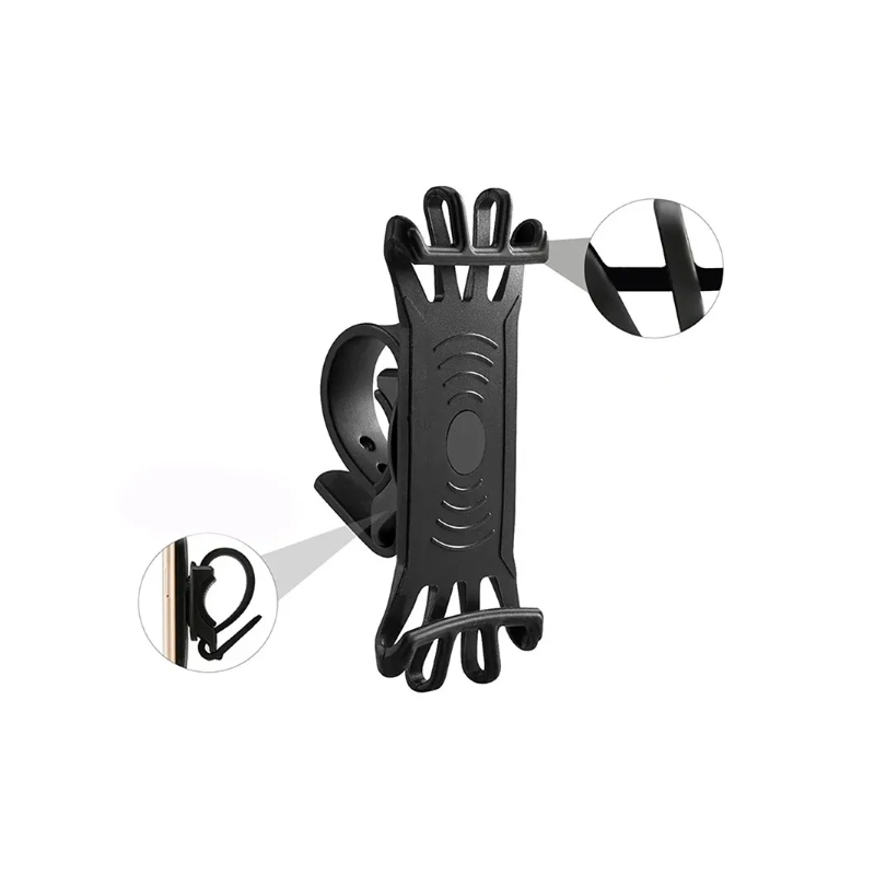 Support de téléphone en silicone avec un joint rotatif à 360°. Convient pour vélo, moto et poussette, compatible avec différentes tailles de mobiles. Description complète