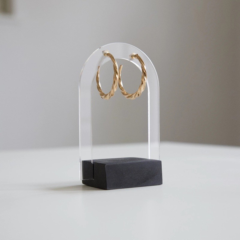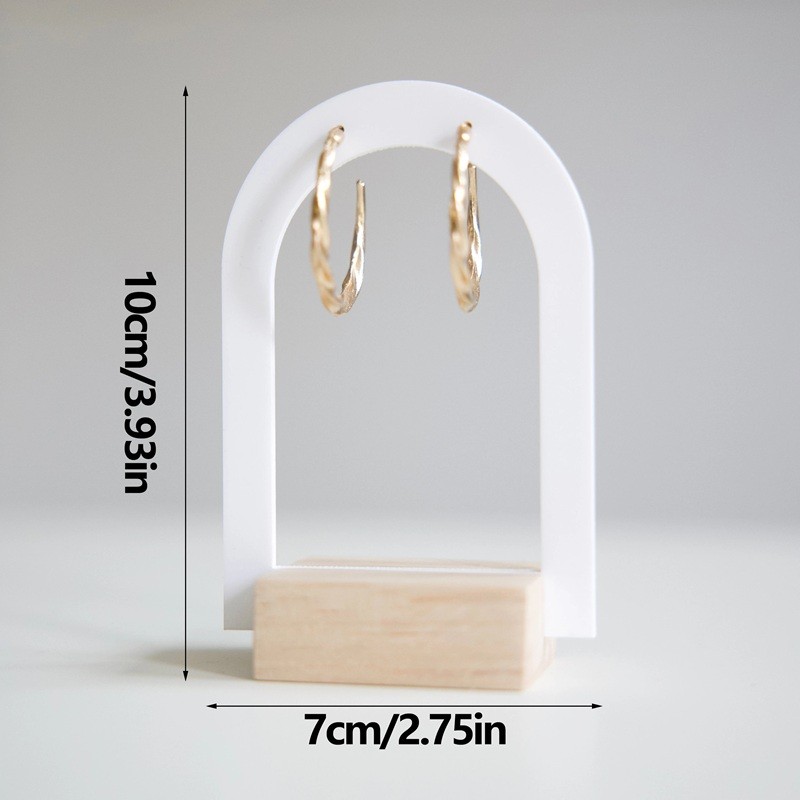 Support simple pour suspendre des boucles d'oreilles en forme d'arc avec une base stable, idéal pour exposer des bijoux sur une table. Description complète