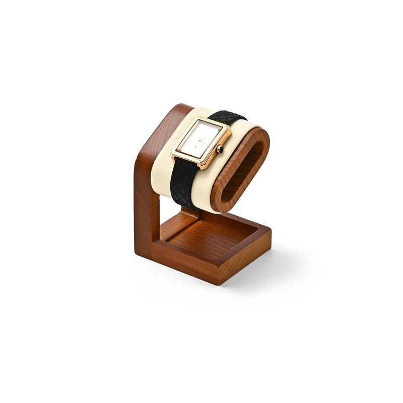 Le support a une base stable et un support en bois incurvé, sur lequel est placé un rouleau rembourré. Les montres peuvent être facilement enfilées sur ce rouleau, ce qui permet une exposition claire.