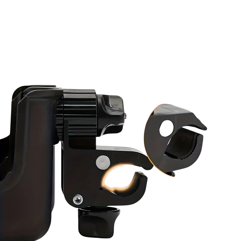 Support multifonction pratique pour bouteille et téléphone pour poussette. Installation facile, maintien solide, rotation à 360°, adapté à la plupart des types de poussettes. Description complète