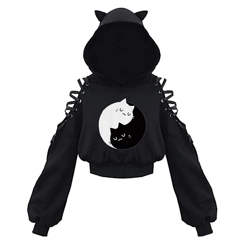 Sweat à capuche femme avec oreilles de chat Sweat noir avec motif de chat et lacets aux épaules Haut de loisirs en mélange de coton et polyester