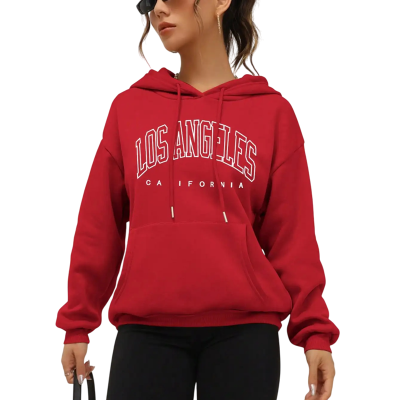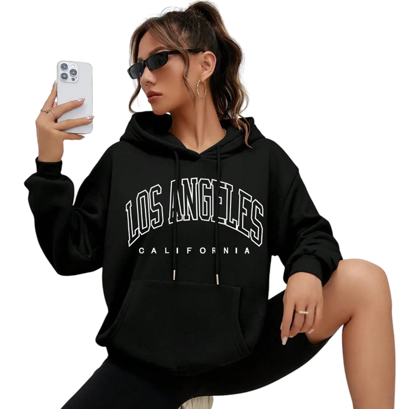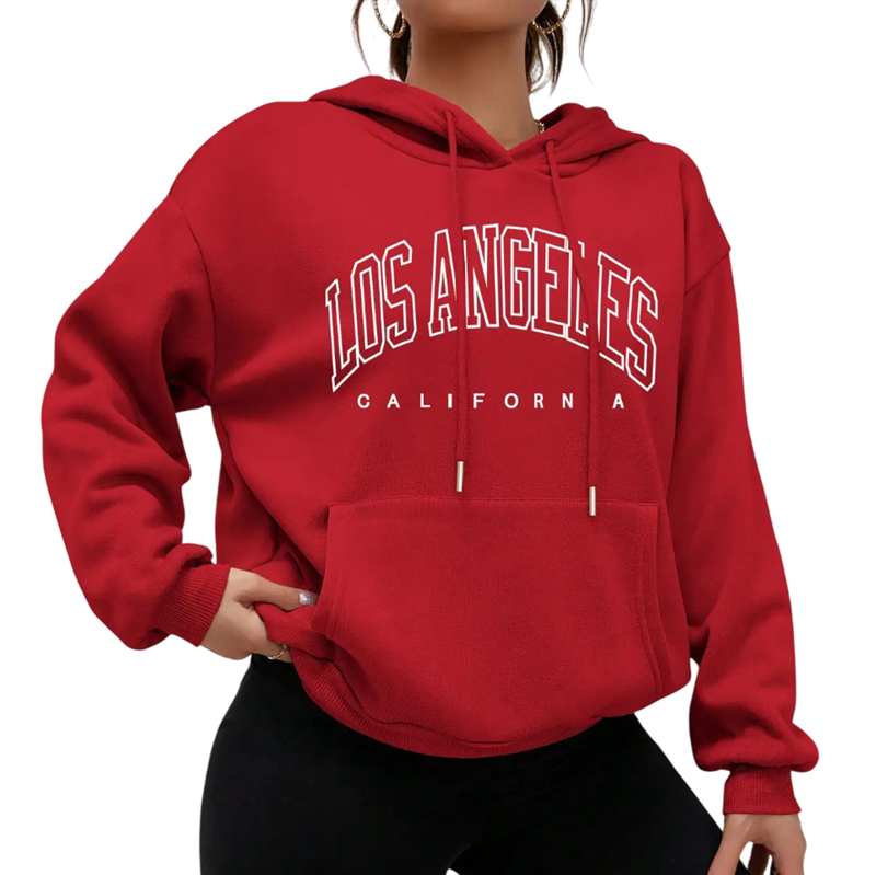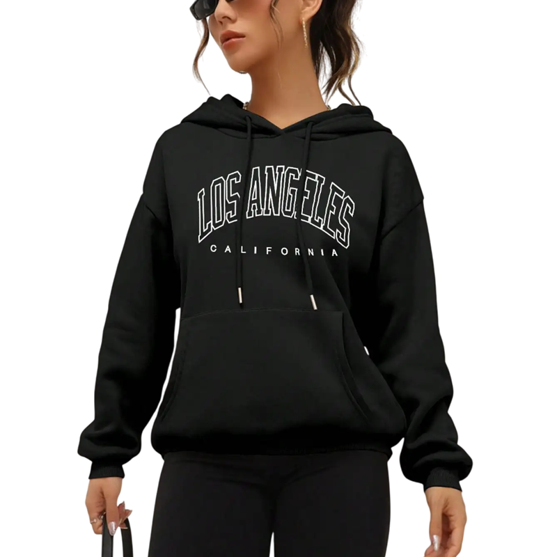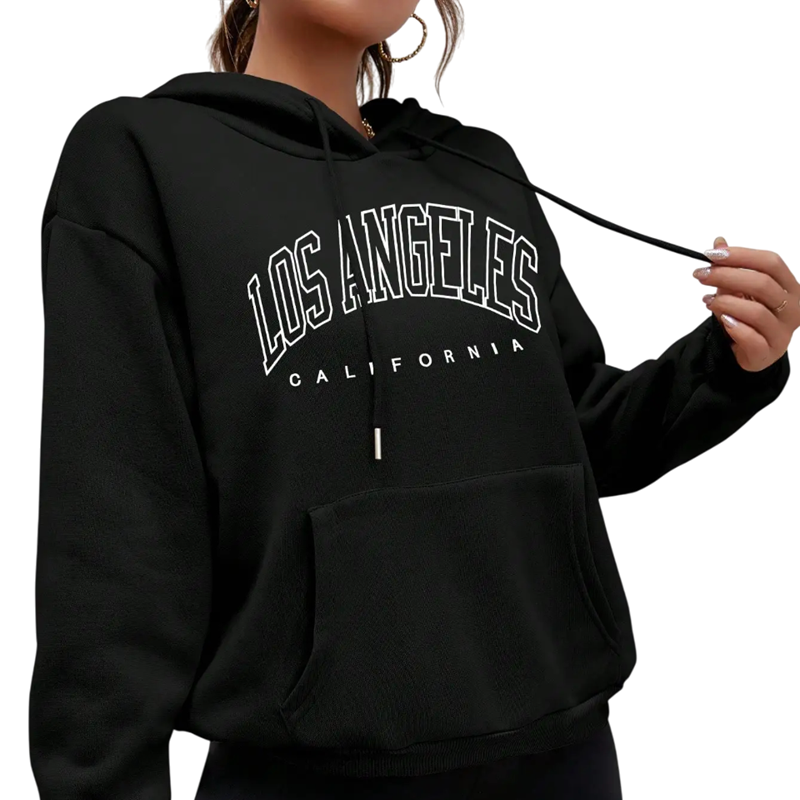 Sweat à capuche stylé pour femmes en polyester doux avec poches et inscription Los Angeles. Confortable, moderne et idéal pour un usage quotidien. Description complète