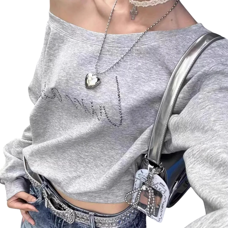 Page d’accueil Page d’accueil Vêtements et accessoires Vêtements et accessoires femme Sweats femme Sweat-shirt femme à une épaule Sweat-shirt gris avec inscription délicate Haut décontracté stylé en mélange doux de coton et de polyester pour un port confortable