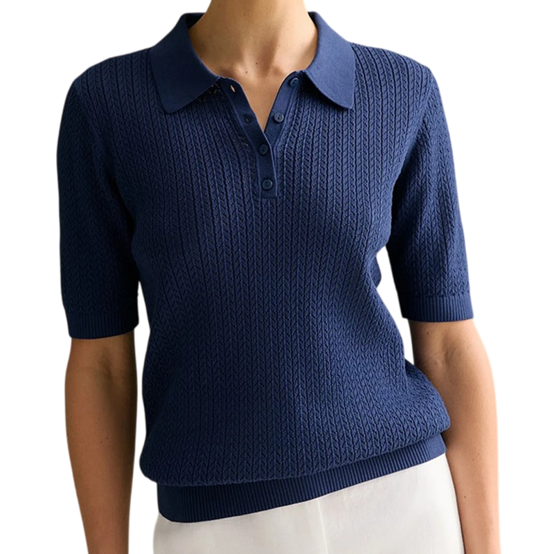 Cet élégant t-shirt à col pour femme allie un look classique à une touche moderne. Grâce à son délicat motif crocheté, il est léger, élégant et sophistiqué. Sa maille respirante assure une sensation agréable même par temps chaud, tandis que sa coupe à manches courtes et son encolure boutonnée lui confèrent une allure discrète et polyvalente. Ce t-shirt est idéal pour le bureau, les loisirs ou les événements sociaux.