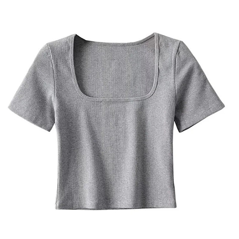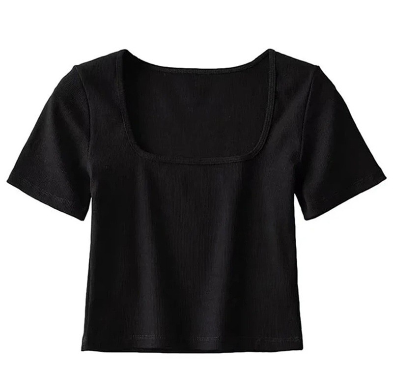 T-shirt à manches courtes pour femme Encolure carrée élégante Coupe ajustée Matière côtelée légère Haut basique élégant pour un usage quotidien