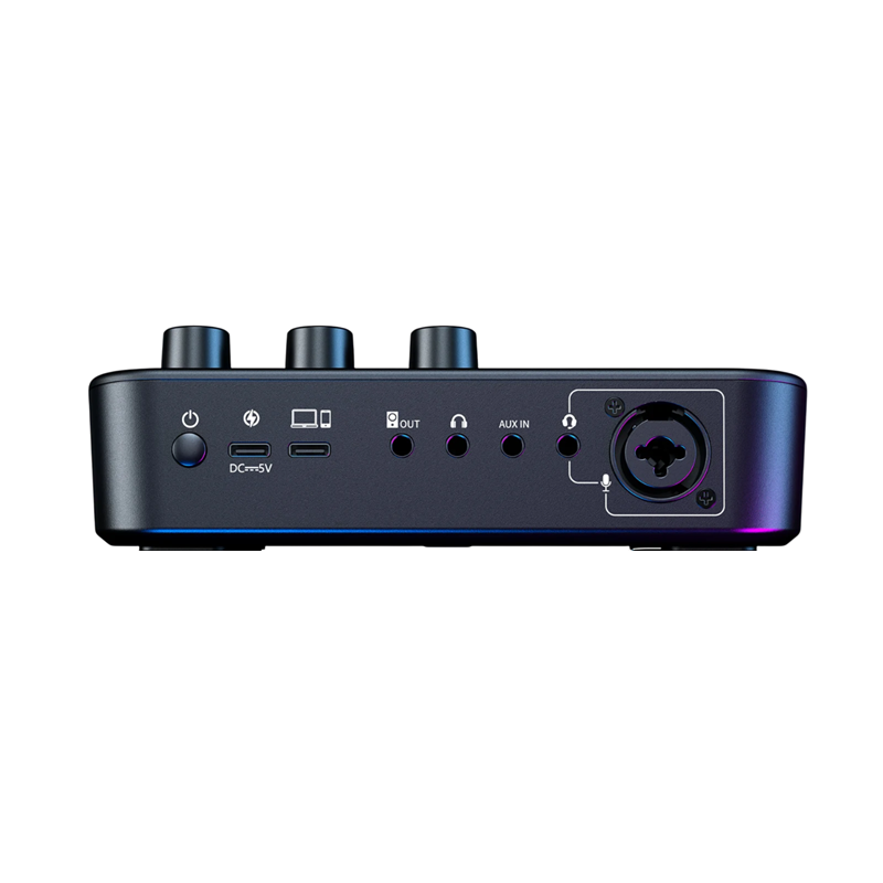 Le dispositif est équipé d'une interface audio de microphone XLR pour connecter des microphones professionnels et d'une sortie jack 3,5 mm pour les écouteurs. La table de mixage est compatible avec les PC et d'autres appareils, et convient pour les streams de jeux, les podcasts, le karaoké ou les réunions en ligne.