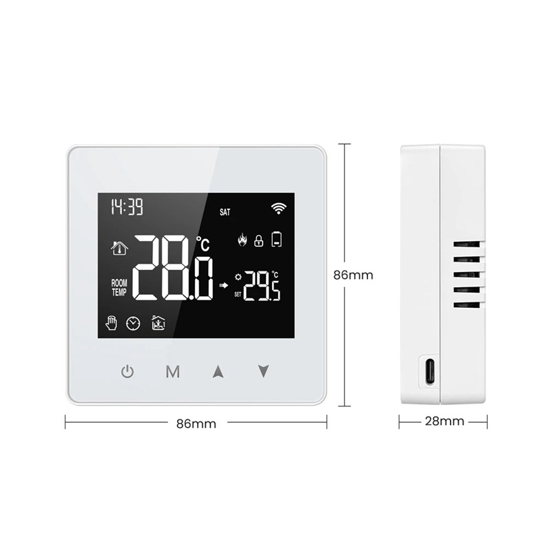 Thermostat intelligent avec contrôle WiFi via application, prend en charge les modes hebdomadaires 5+2/6+1, dimensions compactes 86x86x28 mm, protection IP20. Description complète