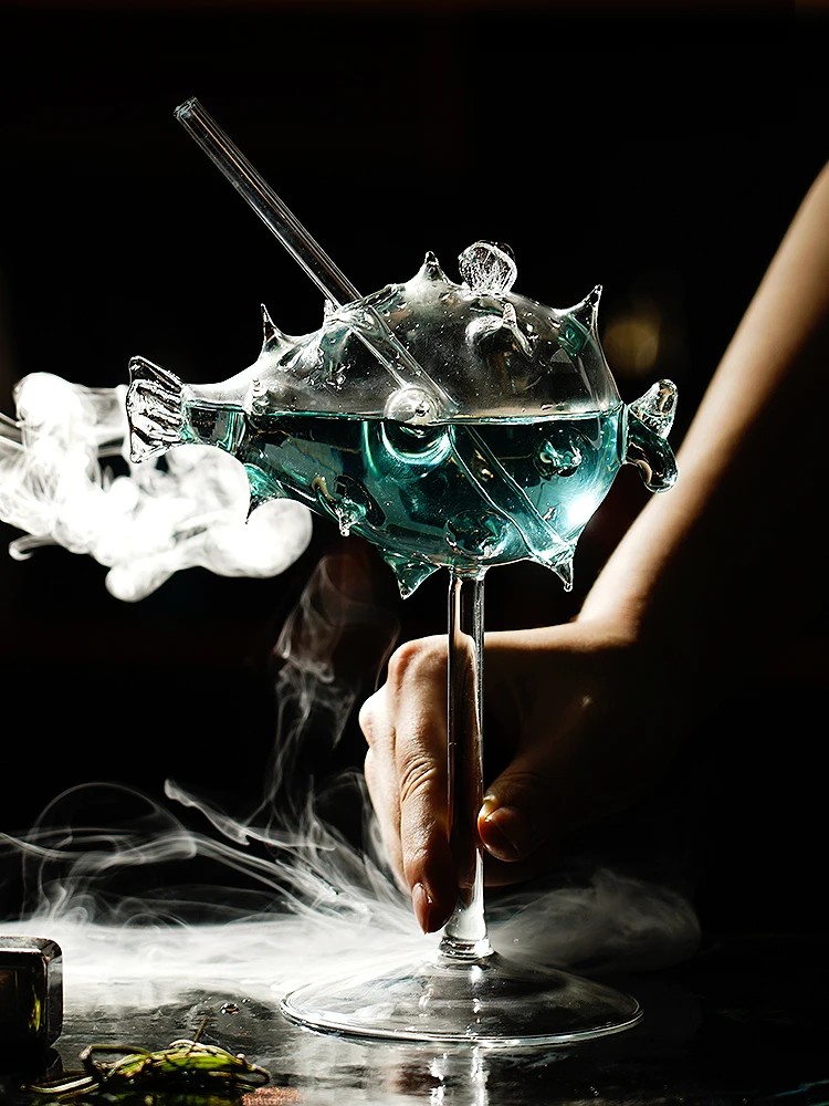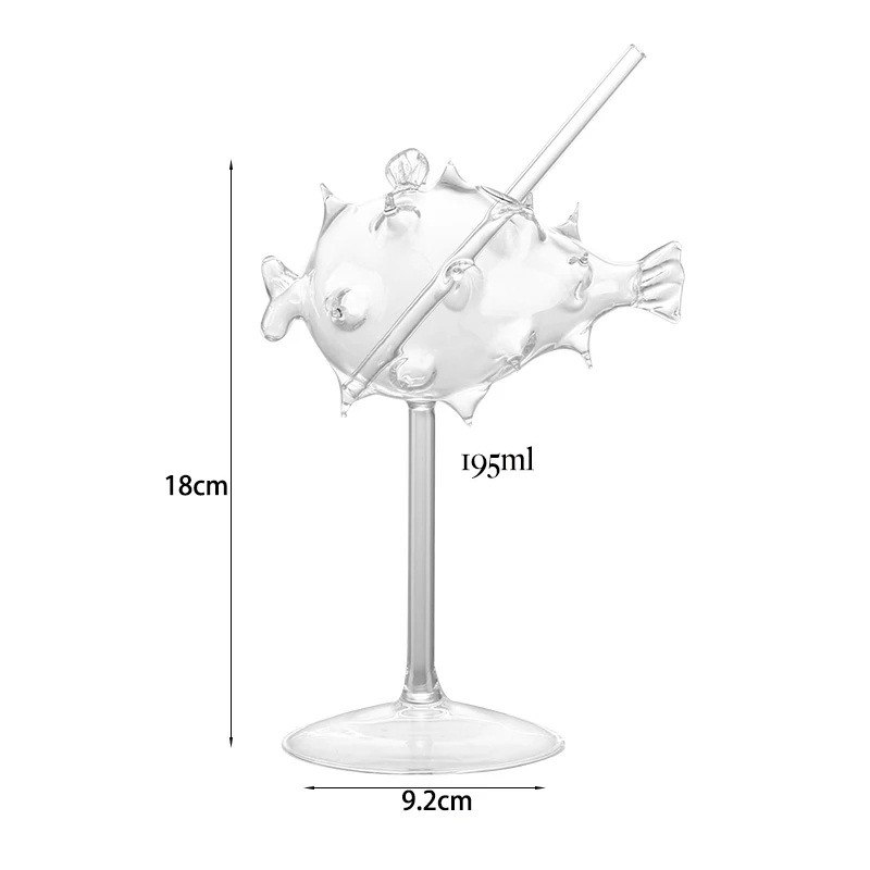 La partie supérieure décorative en forme de poisson donne au verre un aspect distinctif. Le design comprend également une paille en verre intégrée, qui fait partie de la construction du verre. Le matériau transparent permet d'utiliser le verre pour servir des boissons colorées ou des cocktails.
