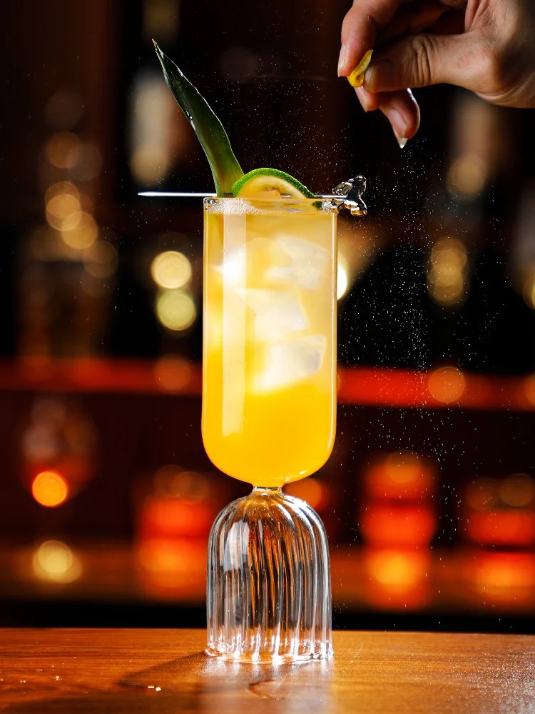 Sa base stable d'un diamètre de 5 cm est décorativement façonnée et aide à assurer une bonne stabilité du verre lorsqu'il est posé sur la table. Le verre est fabriqué en verre transparent, ce qui permet de faire ressortir naturellement la couleur de la boisson.