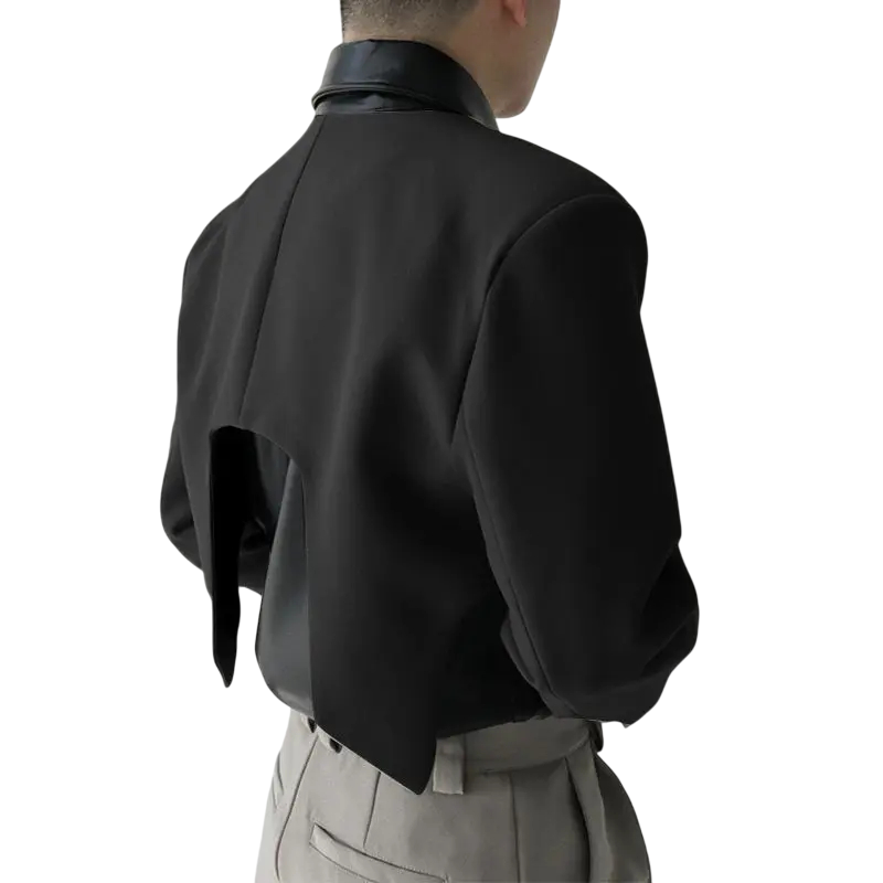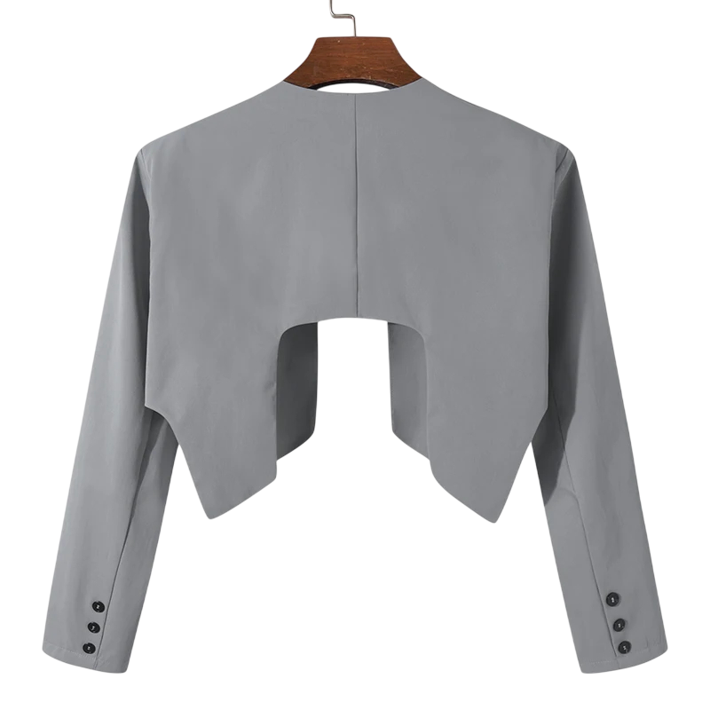 Veste courte tendance pour homme en polyester avec une coupe irrégulière et des poches, offrant un look moderne, du confort et du style pour les tenues quotidiennes et de soirée. Description complète