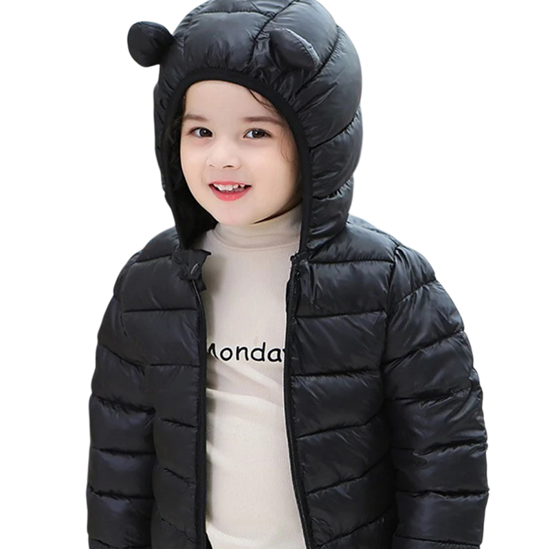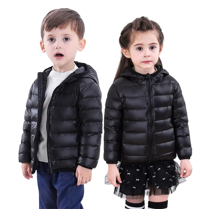 Veste d'hiver chaude pour enfants avec capuche, design uni et fermeture éclair ainsi que boutons-pression. Polyester résistant assurant confort et protection par temps froid. Description complète
