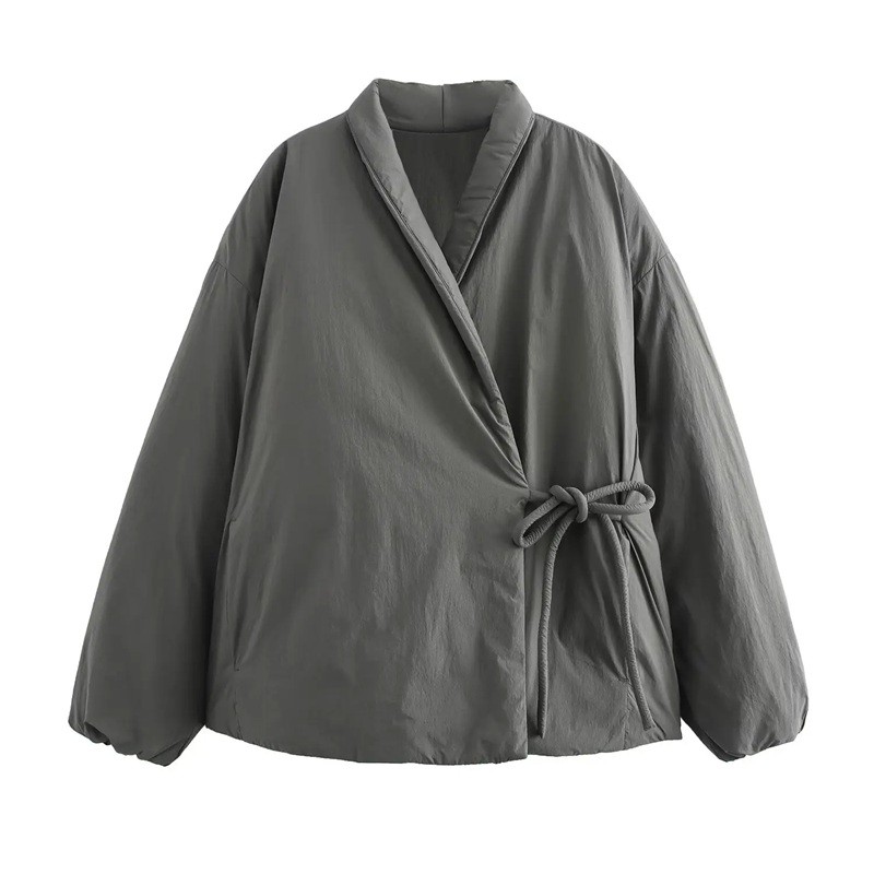 Page d’accueil Page d’accueil Vêtements et accessoires Vêtements et accessoires femme Vestes et manteaux femme Vestes d'hiver femme Veste d'hiver pour femmes avec décolleté en V Veste élégante en polyester Liens latéraux à nouer Coupe confortable Manteau d'hiver stylé