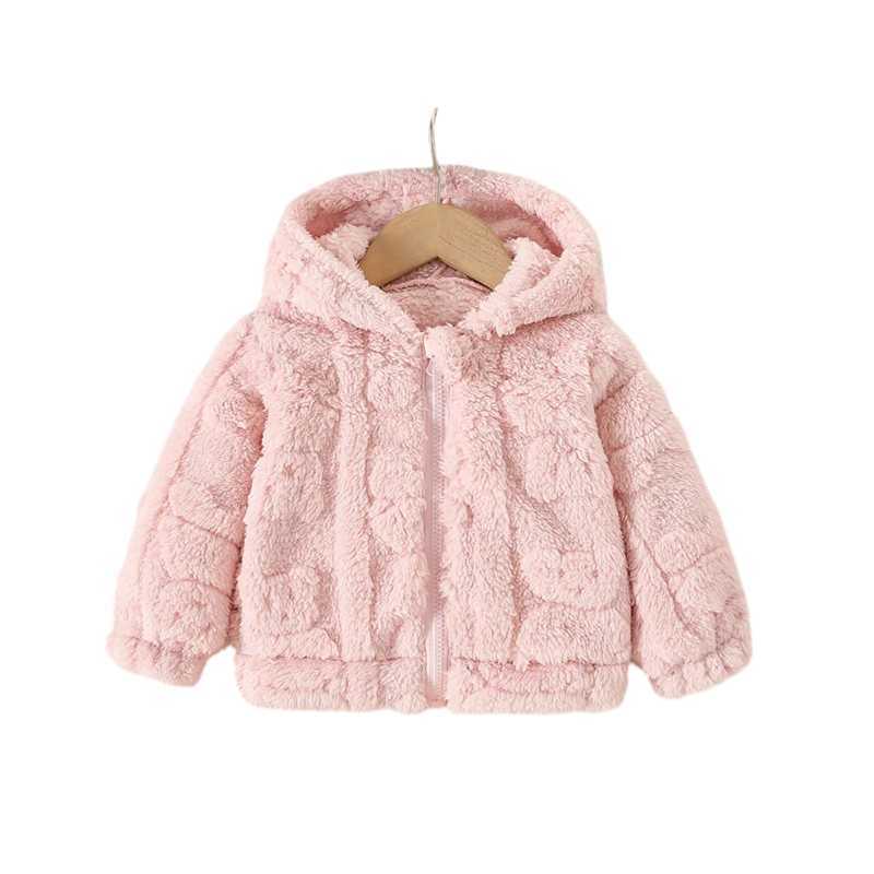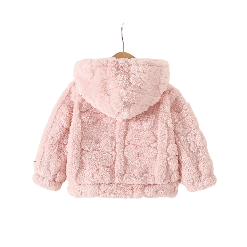 Veste d'hiver pour fille douce et chaude avec surface en peluche, capuche et joli motif d'ours en peluche. Conception en polyester chaude idéale pour un port quotidien en hiver. Description complète