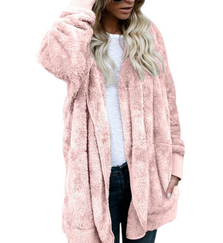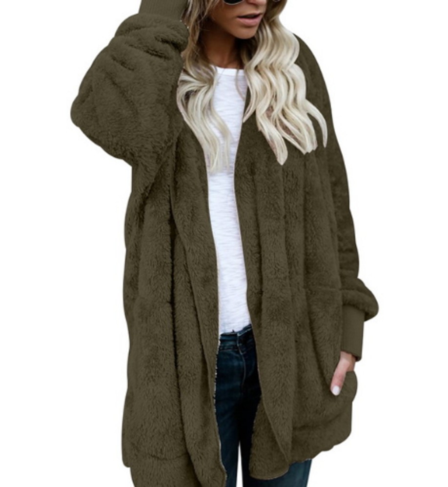La veste a une coupe plus ample et ne se ferme pas, elle a une capuche et également des poches.