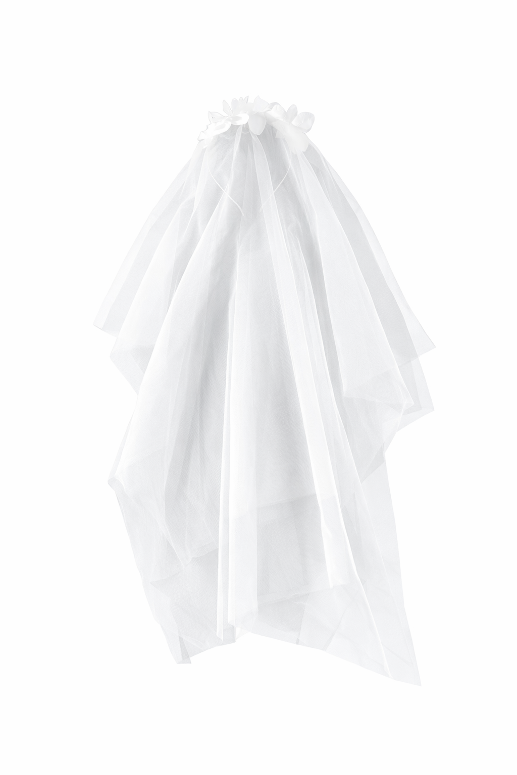 Voile romantique en tulle blanc avec couronne florale. Accessoire de mariage délicat idéal pour un mariage, une séance photo ou un enterrement de vie de jeune fille. Description complète