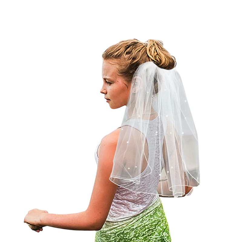 Voile de mariage court en tulle fin avec perles et peigne pour une fixation facile. Élégant accessoire pour un look romantique de la mariée. Description complète